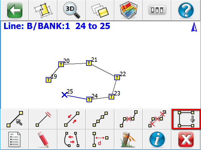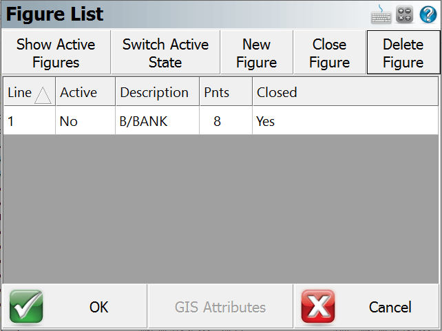 To make a closed figure with an Active Line, select the Close Current Line button on the line toolbar. This will draw a line from the last point to the first point shot in the figure. The Line will be removed from the Active Lines list as it is now considered complete. |